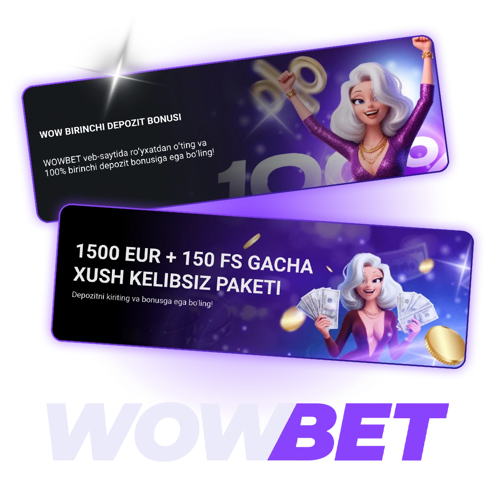 Wowbet platformasi Oʻzbekiston oʻyinchilari uchun onlayn kazino oʻyinlari va sport garovlarini taklif qiladi. Platformada turli xil bonuslar mavjud. Yangi foydalanuvchilar kazino uchun 1500 EUR + 150 bepul aylanish olishlari mumkin. Sport garovlari uchun 1210991.05 UZS taqdim etiladi. Roʻyxatdan oʻting va bonuslaringizni oling.