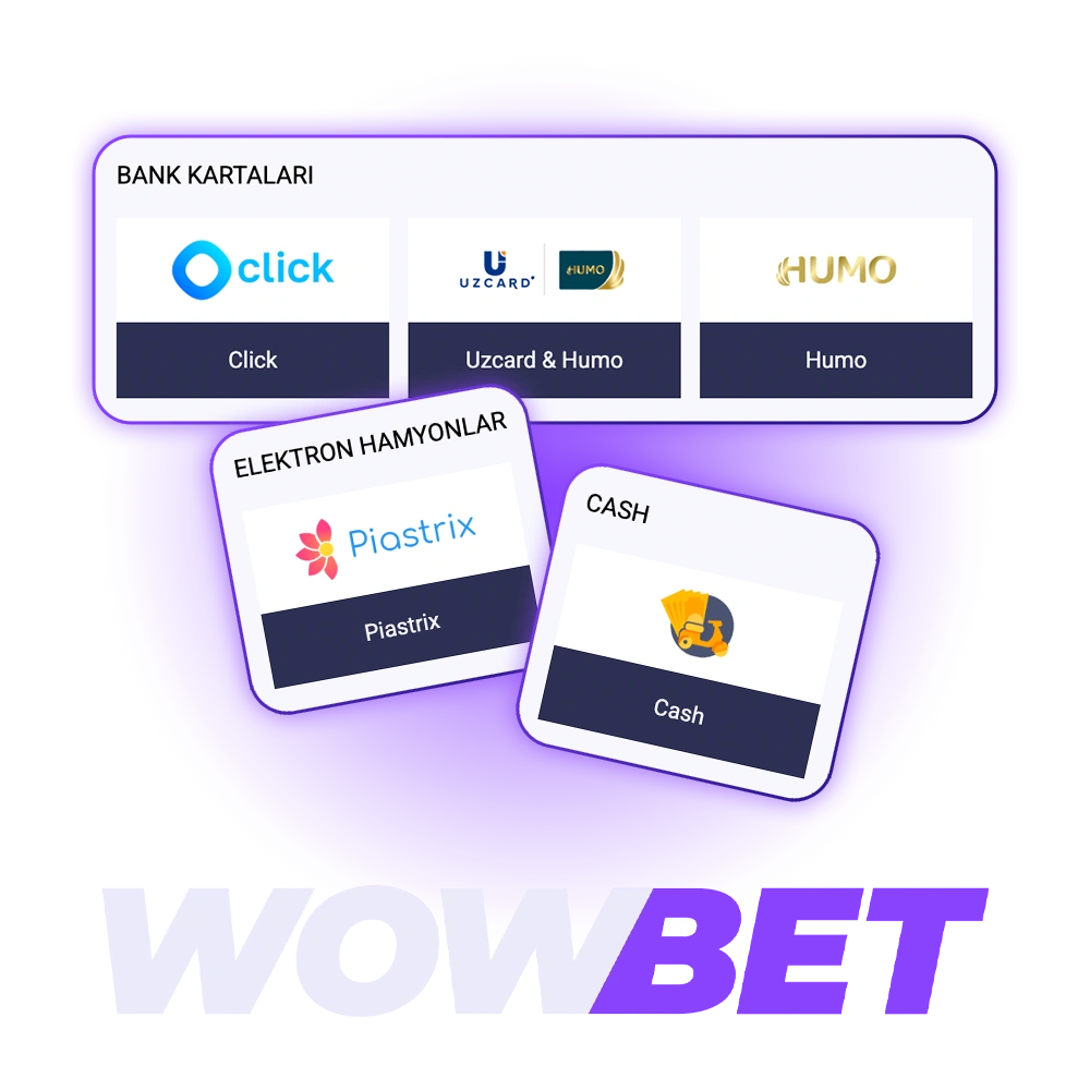 Wowbet platformasi O’zbekiston o’yinchilari uchun Click, UZCard, HUMO, UZ telegram bot, UZS kassa va PayMe orqali pulni yechib olish imkoniyatini taqdim etadi. Minimal yechib olish summasi 50 000 UZS, maksimal summa esa 100 000 000 UZS ni tashkil qiladi. Barcha operatsiyalar 0-72 soat ichida qayta ishlanadi. Yangi foydalanuvchilar uchun Casino bo’yicha 1 500 EUR + 150 FS, Sport bo’yicha esa 1 210 991.05 UZS miqdorida xush kelibsiz bonus taqdim etiladi.