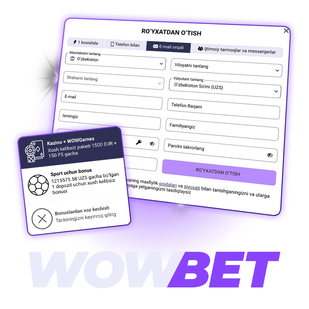 O‘zbekiston o‘yinchilari uchun Wowbet platformasida hisob ochish – sport tikish va onlayn kazino o‘yinlariga kirish kaliti. Ro’yxatdan o’tish jarayoni sodda va tez, bir necha daqiqada tugaydi. Shaxsiy hisobingizga kirish tikish, depozitlar va g’alabalarni yechib olish imkoniyatini beradi. Hisob tekshiruvi xavfsizlikni ta’minlaydi va pul chiqarishni kafolatlaydi. Veb-sayt va mobil ilovada barcha jarayonlar qulay tarzda ishlab chiqilgan. Registratsiya, kirish va verifikatsiya hamma uchun tushunarli. Qo’llab-quvvatlash xizmati har qanday savolda yordam beradi. Yangi foydalanuvchilar uchun Kazino bo’yicha 1500 EUR + 150 FS va Sport tikish uchun 1210991.05 UZS xush kelibsiz bonusi tayyorlangan.